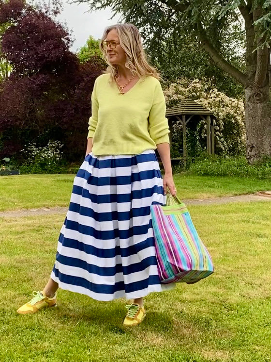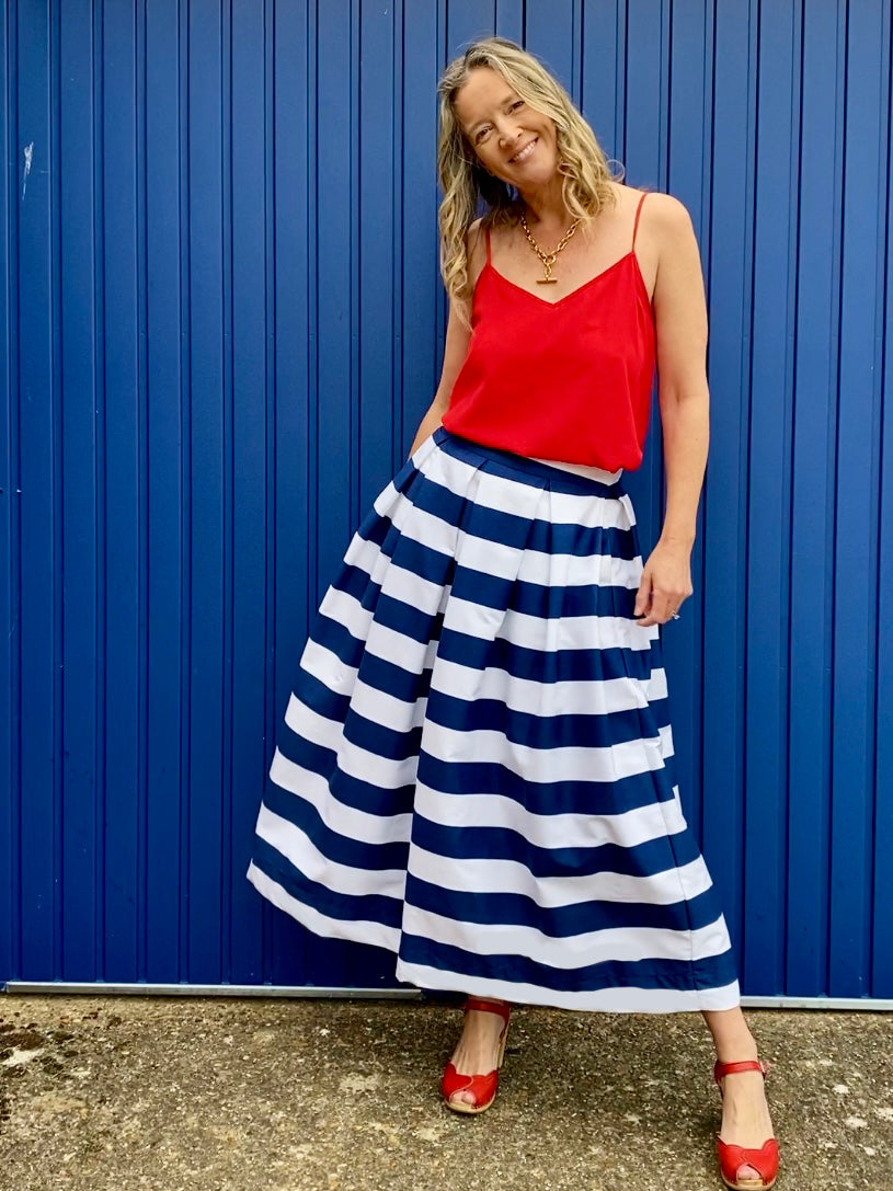 Introducing the 'Diane' skirt in navy and white stripe, made exclusively in England out of beautiful 100% cotton twill. This is a beautiful printed cotton with a 5cm stripe in a rich navy and clean white, printed in France.